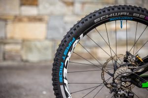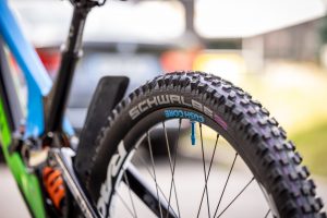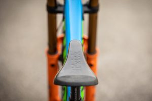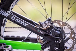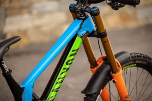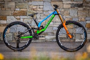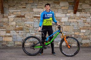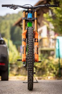 Our theme for World Championships in Les Gets was a connection with the Slovenian national team and the colors of the national federation. Hence we modified our Canyon Senders in the green and blue colors, and we also made a new jersey to match the bike.